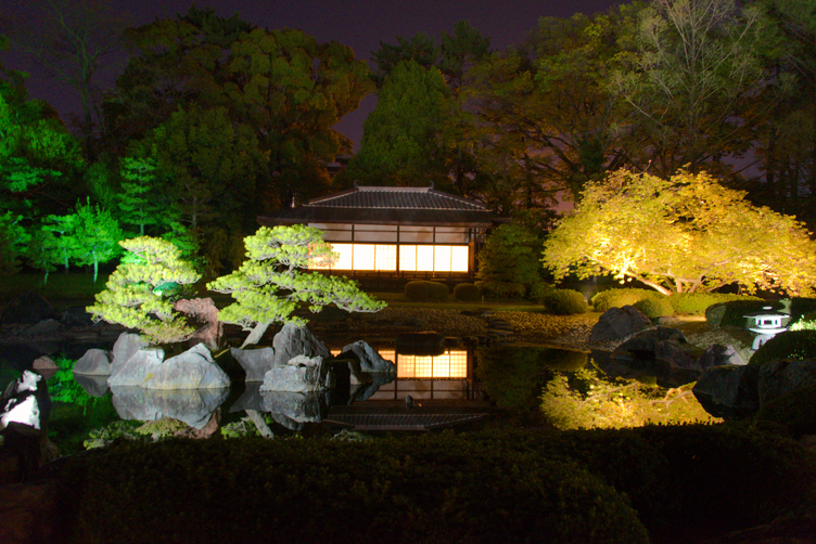 This view is looking north across the northern pond at the Koun-tei teahouse on the grounds of Nijō-jō Castle. The surface of the pond was still enough to yield a mirror-like effect.